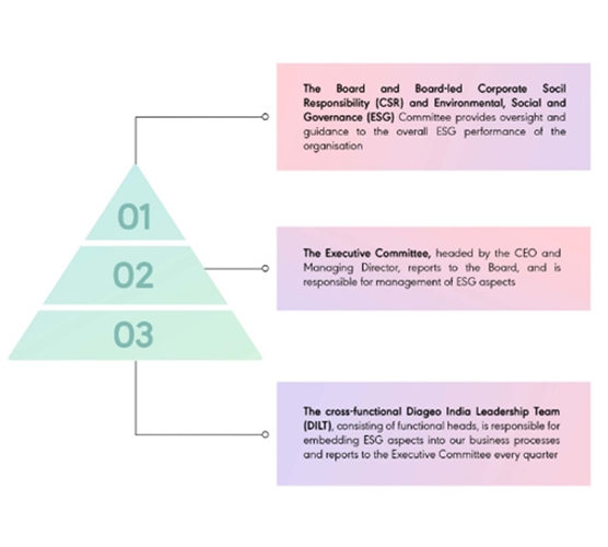 At Diageo India, ESG governance is structured through a multi-tiered framework. The Board and Board-led CSR & ESG Committee provide strategic oversight on ESG strategy, risks, and disclosures, ensuring alignment with regulatory and stakeholder expectations. The Executive Committee, led by the MD & CEO, is accountable for delivering ESG goals across the business and integrates ESG into core operations and decision-making, while reporting key developments to the Board. The Chief Supply & Sustainability Officer (CSSO) and Corporate Relations Director (CRD) jointly lead the execution of the ESG strategy, with responsibilities spanning environmental performance, stakeholder engagement, and external advocacy. The Diageo India Leadership Team (DILT) operationalizes ESG priorities across functions and regions, tracking performance and reporting quarterly to the Executive Committee. Lastly, all employees, suppliers, and contractors are expected to uphold ESG policy standards, participate in relevant initiatives, and proactively report any risks or non-compliance through established channels.